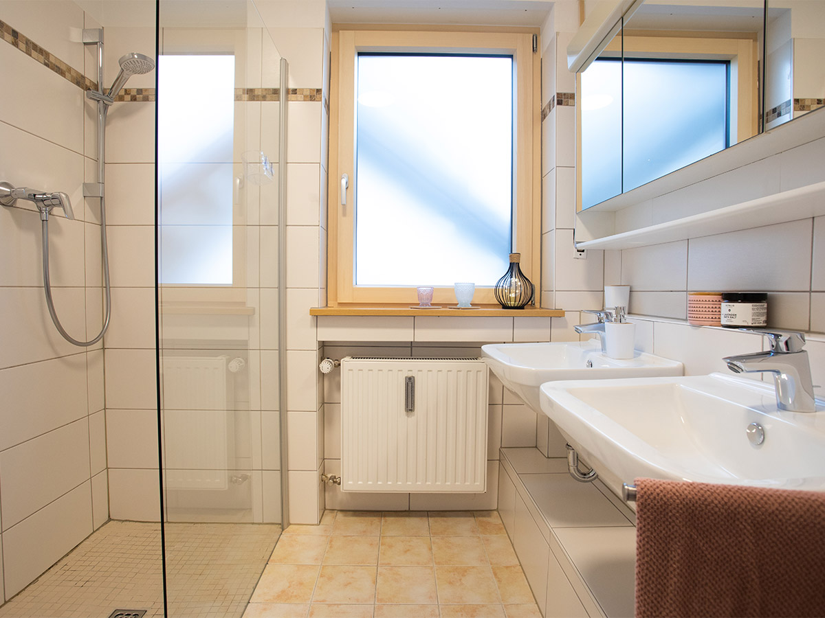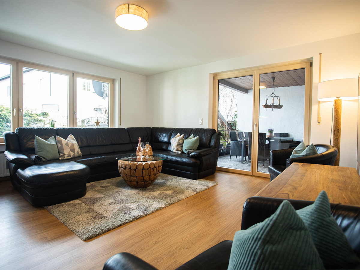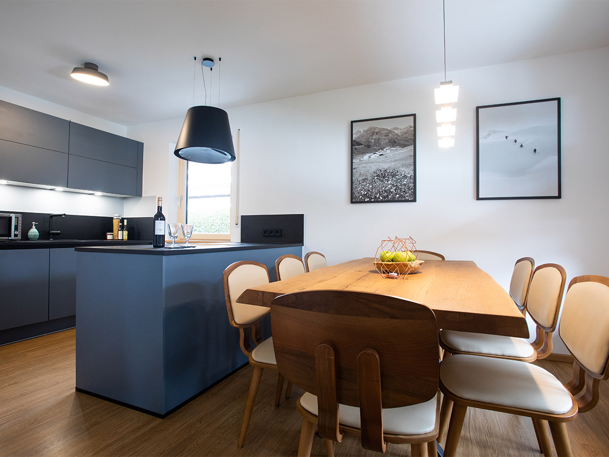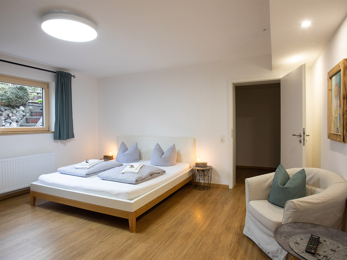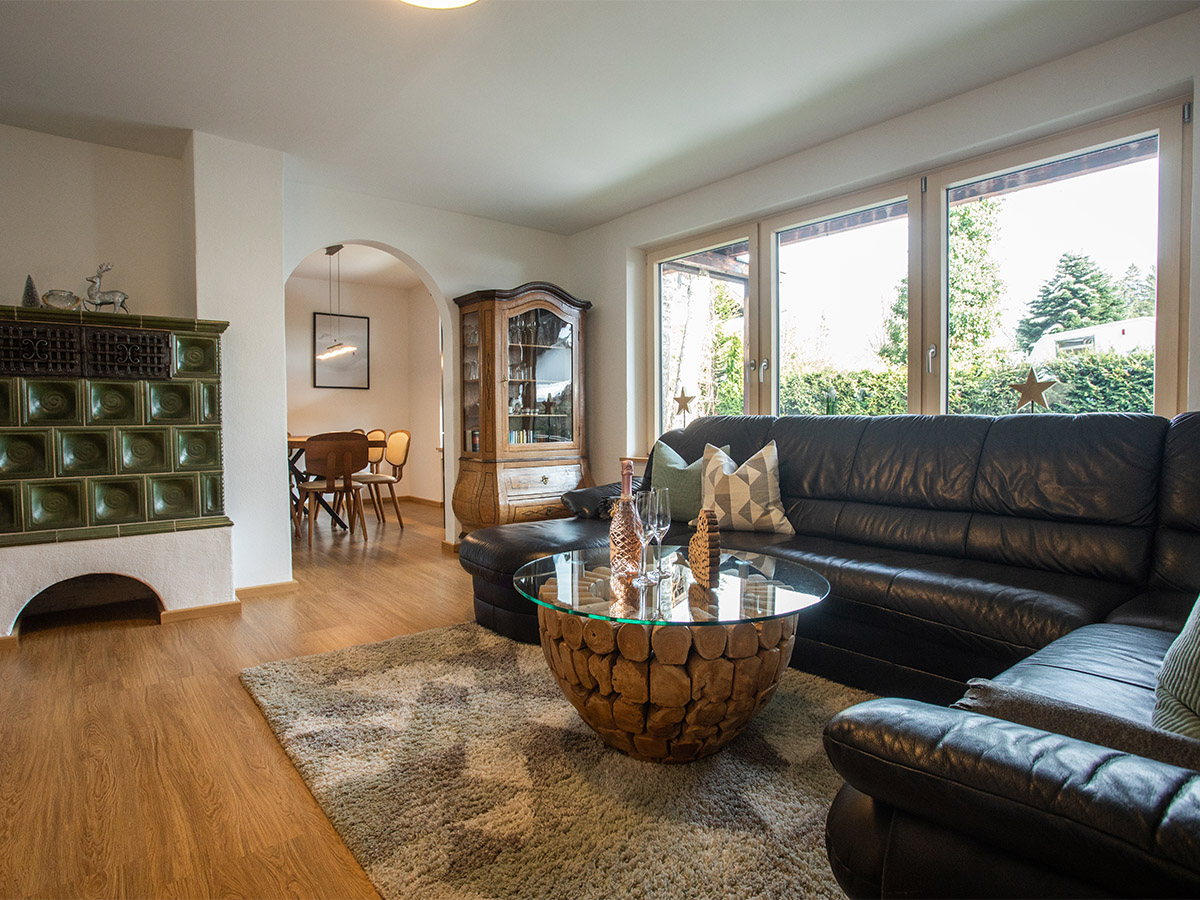 Im Erdgeschoss befindet sich die offene Küche mit dem Essplatz. Durch einen Rundbogen gelangen Sie in den großzügigen Wohnraum mit einer Sitzgruppe und einem traditionellen Kachelofen. Das Wohnzimmer hat eine große Fensterfront und den Zugang zum Freisitz und zum kleinen aber feinen Garten. Außerdem sind im Erdgeschoss zwei Schlafzimmer mit jeweils einem Doppelbett, ein Badezimmer mit Dusche sowie die Gästetoilette.