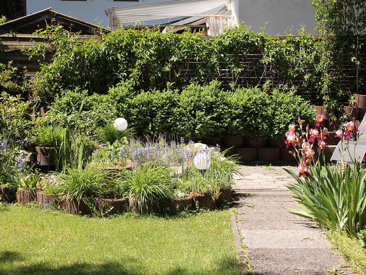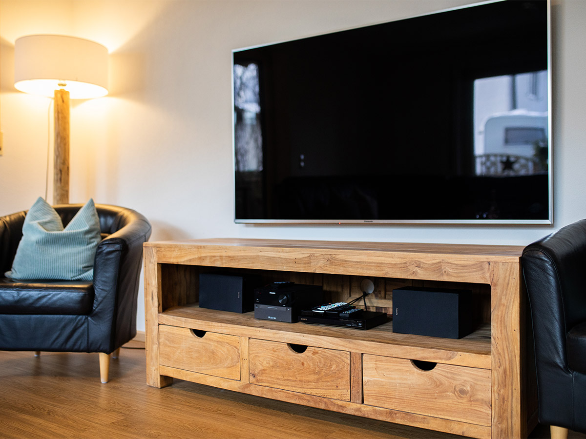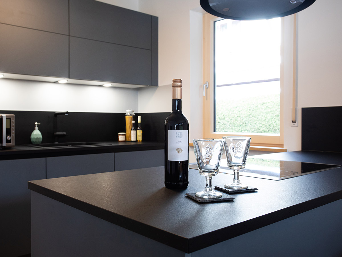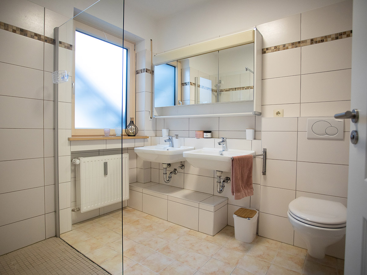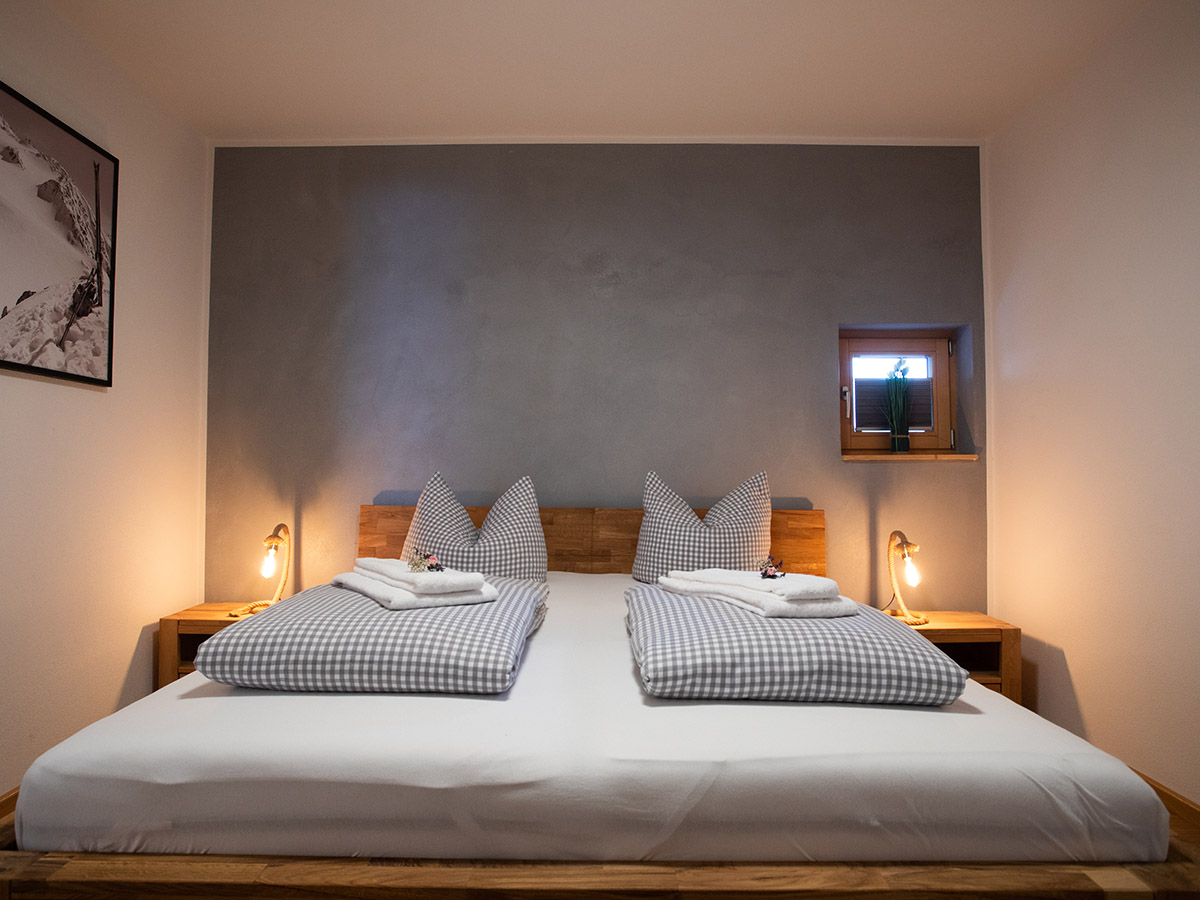 Im Erdgeschoss befindet sich die offene Küche mit dem Essplatz. Durch einen Rundbogen gelangen Sie in den großzügigen Wohnraum mit einer Sitzgruppe und einem traditionellen Kachelofen. Das Wohnzimmer hat eine große Fensterfront und den Zugang zum Freisitz und zum kleinen aber feinen Garten. Außerdem sind im Erdgeschoss zwei Schlafzimmer mit jeweils einem Doppelbett, ein Badezimmer mit Dusche sowie die Gästetoilette.